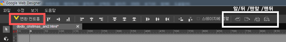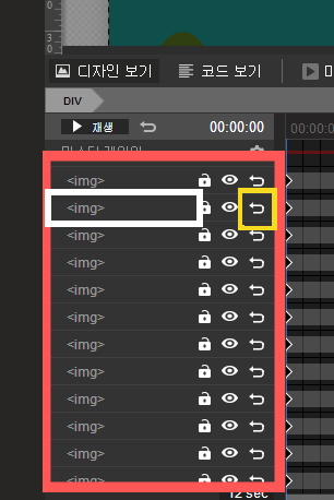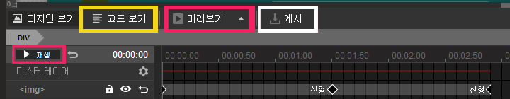 타임라인 윗부분에 코드 보기를 누르면 디자인한 작업의 전체 코드를 작업 창에서 보실 수 있습니다. 그 옆의 미리 보기를 누르면 브라우저로 작업물을 확인할 수 있습니다. 브라우저는 크롬과 인터넷 익스플로러 두 가지입니다. 타임라인의 재생버튼을 누르면 작업창 안에서 작업물이 동작하는 모습을 볼 수 있습니다. 재생버튼 옆의 휘어진 화살표를 누르면 재생이 계속 반복해서 됩니다. 맨 오른쪽의 게시버튼은 작업물을 추출할 수 있는 버튼입니다.