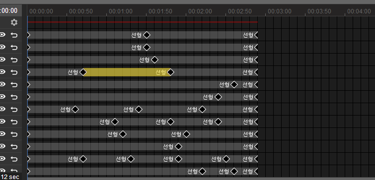 타임라인의 시간 범위를 설정할 수 는 없습니다. 그저 원하는 마지막 시간위치에 키프레임을 놓는 것이 범위 설정 방법입니다. 원하는 위치에서 우클릭을 하면 키프레임을 삽입할 수 있습니다. 타임라인을 복사해서 다른 레이어에 붙일 수 없습니다. 타임라인 위의 키프레임들이 중복 선택이 안 될뿐더러 alt+탭을 눌러 개별 복사하는 기능도 먹히지 않습니다. 키프레임과 키프레임 사이에 마우스를 대고 우클릭을 하면 easing(이징) 기능이 있습니다. 움직임의 가속과 감속을 조절할 수 있는 기능입니다.