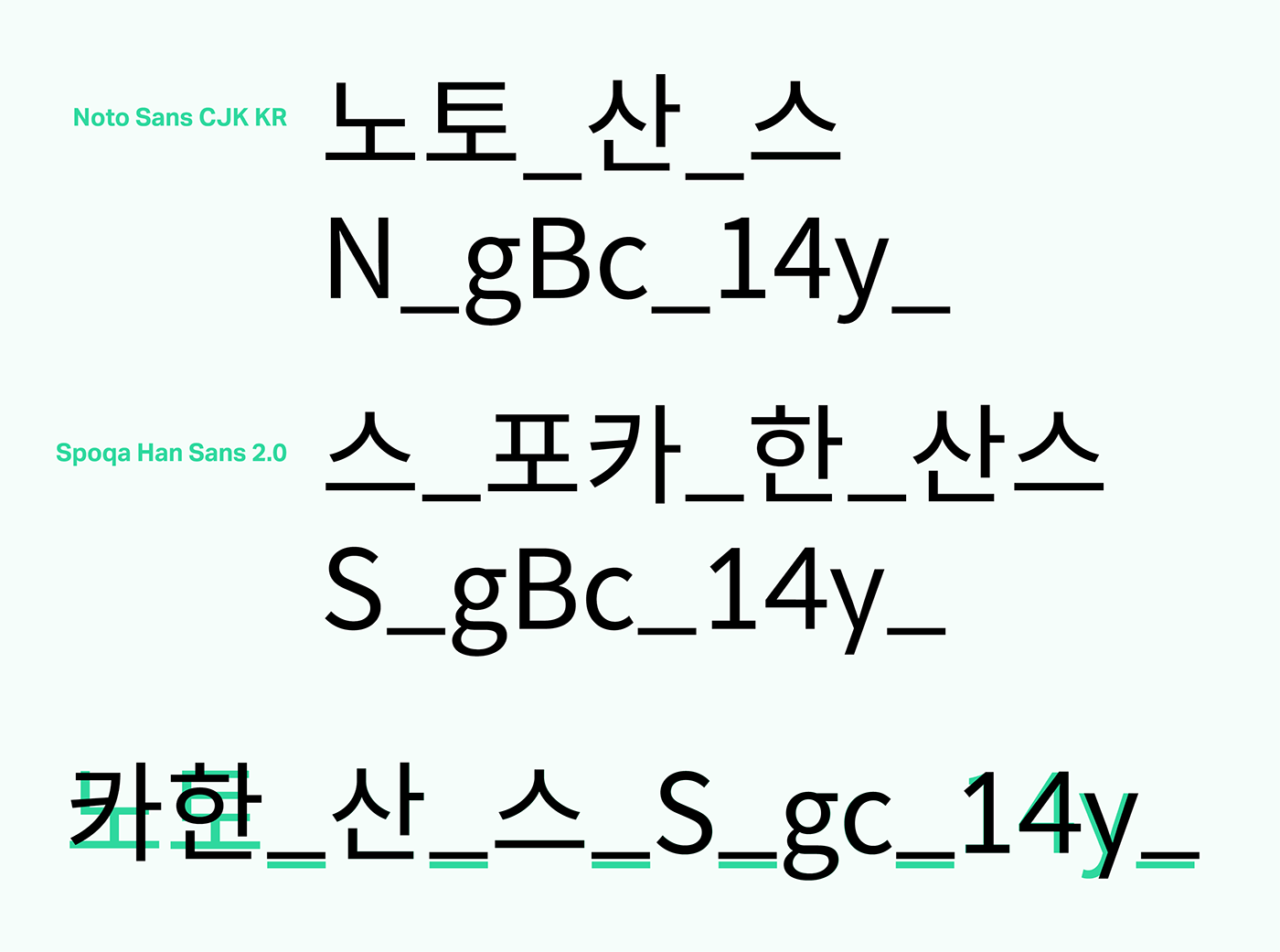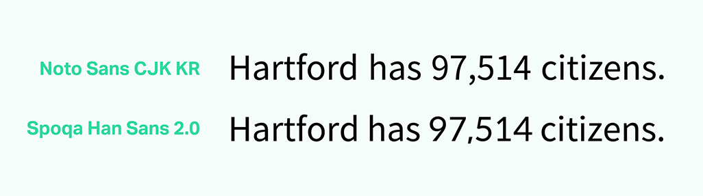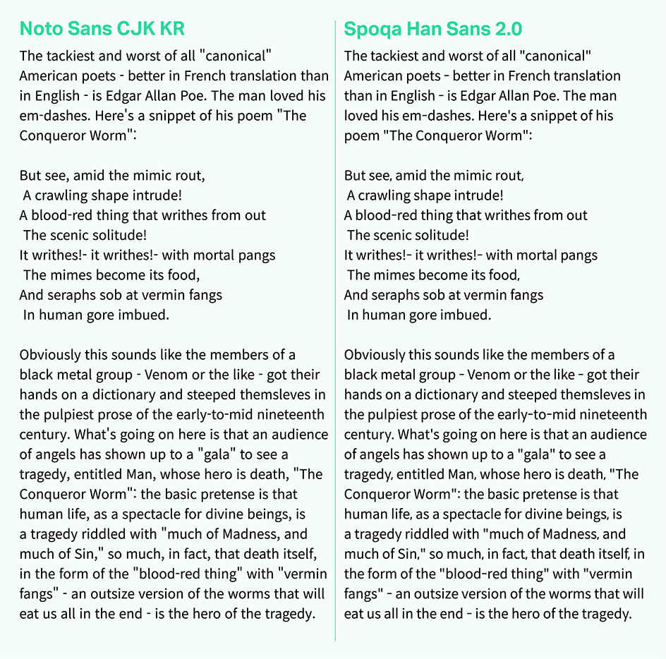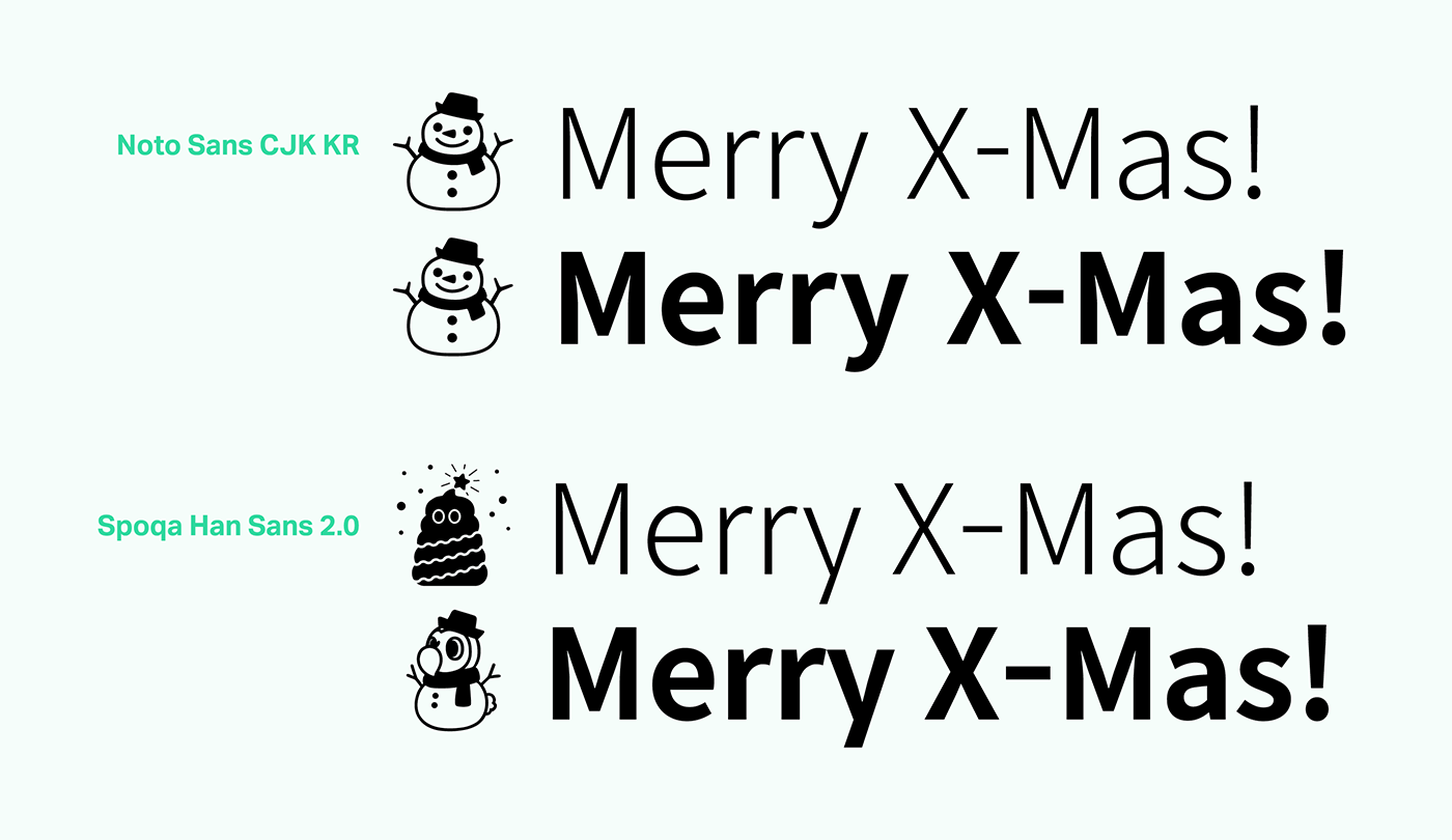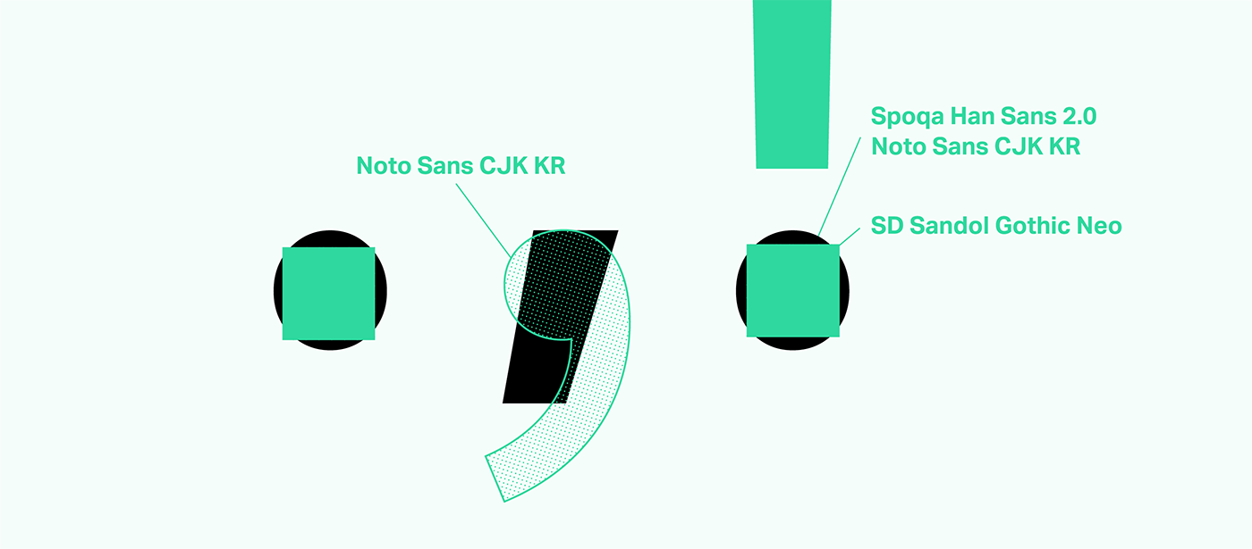 스포카 한 산스가 어디에 주로 쓰일 것인지 명확했고, 철저히 그 조건에 부합하려고 노력했습니다. 노토산스CJK KR은 한글을 디자인한 디자이너가 영문이나 기타 글리프를 직접 디자인한 게 아니고 오픈산스를 가져와 붙인 것입니다. 물론 한글과 영문을 함께 쓰기에 부족함이 없도록 노력한 흔적들이 많고, 디자이너라면 이를 잘 찾아 적용할 수 있을 겁니다. 하지만 일반인들이 이런 방법을 알기는 힘들며, 앞서 말했듯 범용 애플리케이션에서 적용하기엔 어려운 점이 있습니다. 그럼에도 불구하고 노토산스CJK KR은 장점이 압도적인 서체이고, 감사하게도 오픈소스로 풀리는 바람에 우리 같은 아마추어도 서체를 새로 만드는 수고에 비해 아주 적은 노력만을 들여 개조할 수 있었습니다. 우리가 개발자 문화에 친숙했고, 오픈소스란 개념이 낯설지 않았던 덕택에 이런 문명의 혜택(?)을 입을 수 있었던 것입니다.