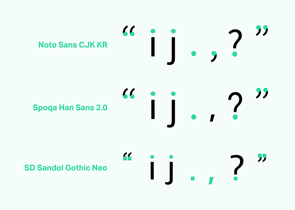 , ? 모양도 마찬가지로 대세를 따릅니다. 참고로 쉼표 모양을 변경하면서 참고했던 Apple 산돌고딕 Neo의 경우 , . ? “ ” ‘ ’ 모두 획의 끝을 각진 스타일을 맞춰줬으나 스한스는 그렇게까지는 안 하기로 했습니다.