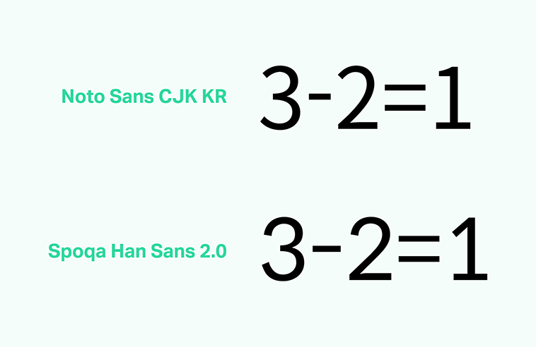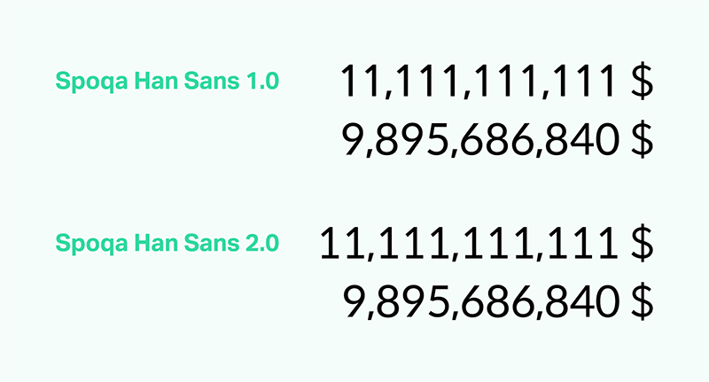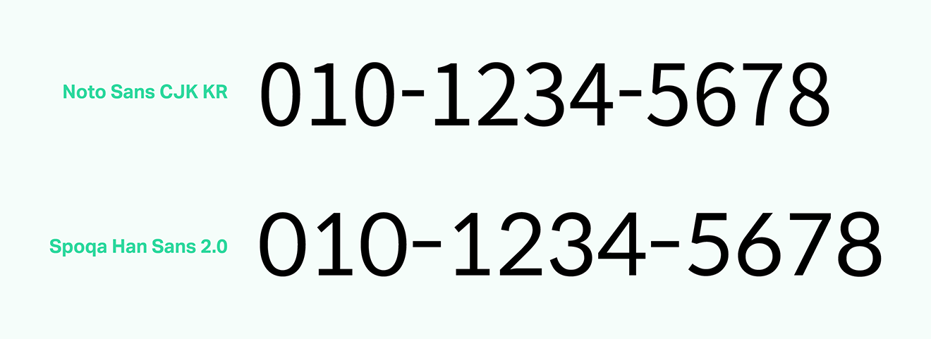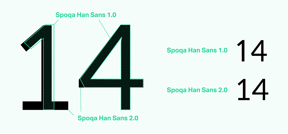 기존 스포카 한 산스는 형태에 대한 커스텀은 라토를 가져옴으로 해결했지만 자폭에 대한 고려는 하지 못했습니다. 왜냐하면 각 숫자 글리프의 형태가 단순한 1부터 양옆으로 빵빵한 8에 이르기까지 다양했기 때문에 각 숫자의 공간을 동일하게 주기 어려웠기 때문입니다. 특히 1의 공간을 해결하기 너무나 어려웠는데요, 이번엔 라토 1의 모양대로 밑에 받침을 넣어주고 상단의 삐침을 길게 빼줘서 고정폭이 되더라도 어색해 보이지 않게 개선했습니다.