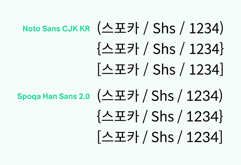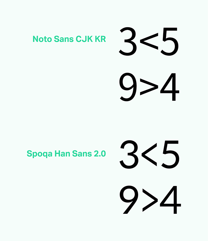키보드에 ‘<’, ‘>’는 사실 수식의 부등호란 사실 알고 계셨나요?(…) 나 또한 스포카 한 산스 커스텀 하면서 알게 된 사실입니다. 허나 이미 수많은 사람이 이를 괄호처럼 사용하고 있으므로, 이게 괄호처럼 쓰여도 과히 이상해 보이지 않았으면 했고 이를 반영한 결과가 다음과 같습니다. 물론 수학 부등호와 괄호를 분명히 구분해주는 것이 맞지만, 많은 사람들이 귀찮고 특수문자를 찾아 넣기 힘들다는 이유로 혼용하고 있기 때문에 이를 무시할 수 없다고 생각했습니다.1