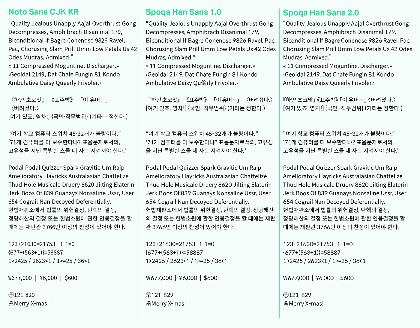 『, 』, 《, 》, 「, 」, 〈, 〉의 경우 사실 유니코드 표준상으로는 전각이 맞습니다.2 하지만 한글 조판 방식의 특성이 고려가 안 된 표준이라 글자 사이를 엄청나게 띄워놓아 가독성을 해치고 글줄에 구멍을 만듭니다. 물론 어도비 프로그램에서는 몇 가지 설정으로 쉽게 미세조정이 가능하나 디자인 툴이 갖춰져 있지 않거나 웹앱 등에서는 미세조정이 불가능하므로 강제로 반각으로 고쳤습니다.3 그러고 보니 스포카 한 산스의 커스텀 내용 중 많은 수가 디자인툴에서만 수정 가능한, 하지만 범용 애플리케이션에서도 니즈가 있던 부분들을 적용해주는 작업이네요.