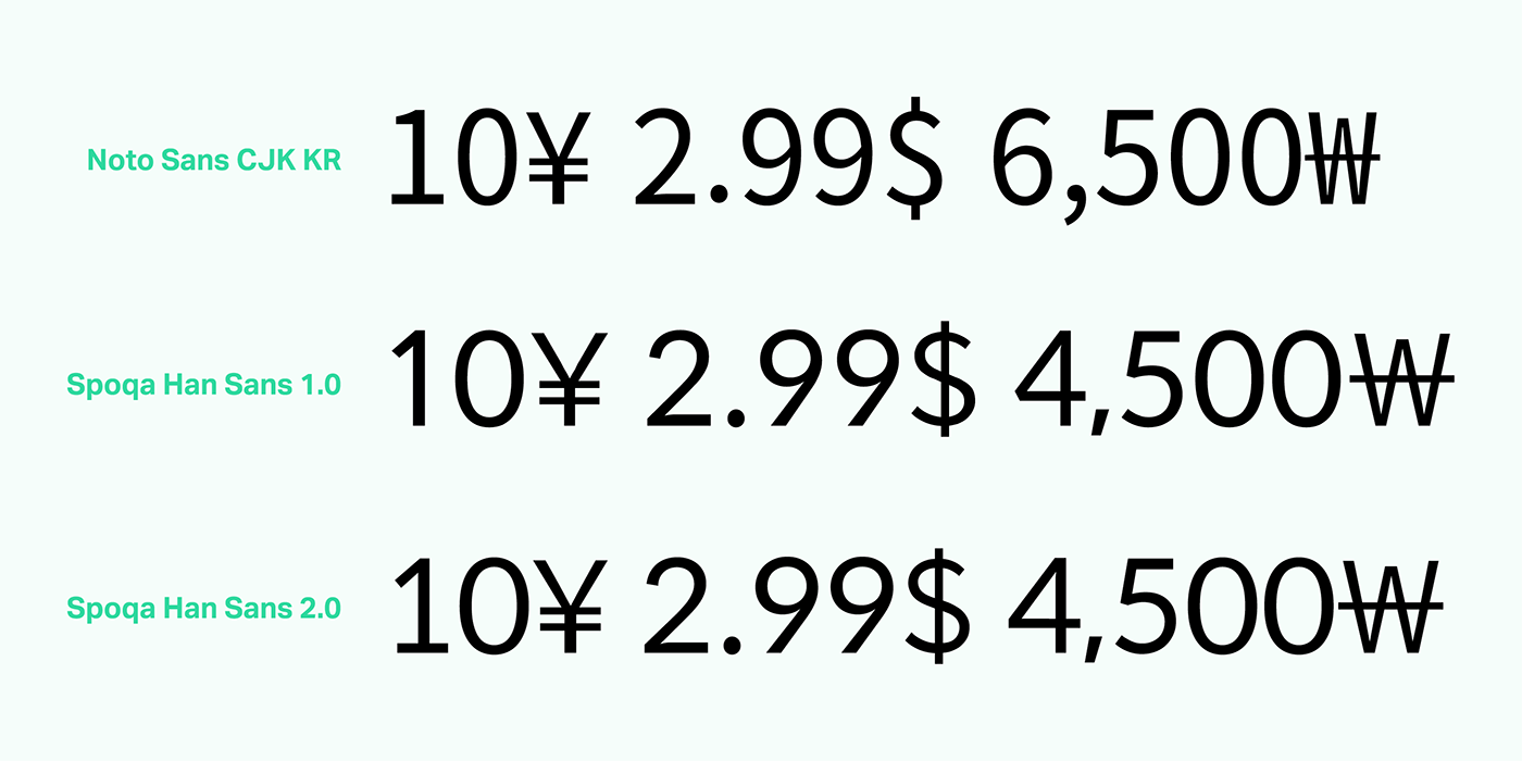 한글, 일본어 및 숫자를 주로 사용하는 서비스 특성에 맞춰, 숫자와 관련된 기호를 영문 소문자 디센더를 상대적으로 덜 고려한 위치로 옮겼습니다.