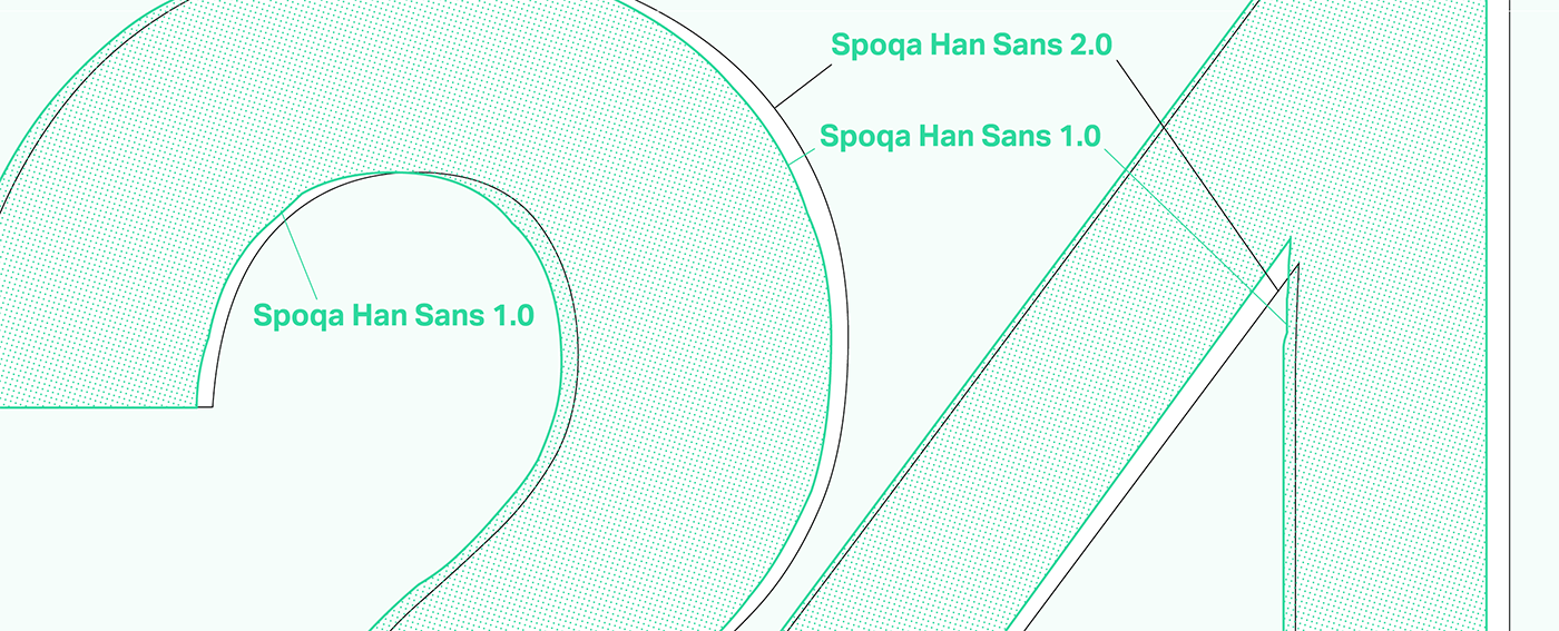 다소 부끄러운 고백이나, 폰트랩이 익숙지 않아서 처음 스포카 한 산스 작업할 땐 수정하고픈 글리프를 모두 일러스트레이터로 그려서 폰트랩에 옮겨오는 식으로 작업했습니다. 이 과정에서 패스가 일그러지는 부분들이 다수 생겼고, 2.0작업하면서 거의 모두 폰트랩으로 다시 그리거나 패스를 정리하였습니다. 웹에서 보면 그리 티 나지 않지만 디자인툴인 일러스트레이터나 인디자인으로 써놓고 크게 확대해보면 일그러진 패스들이 보입니다.