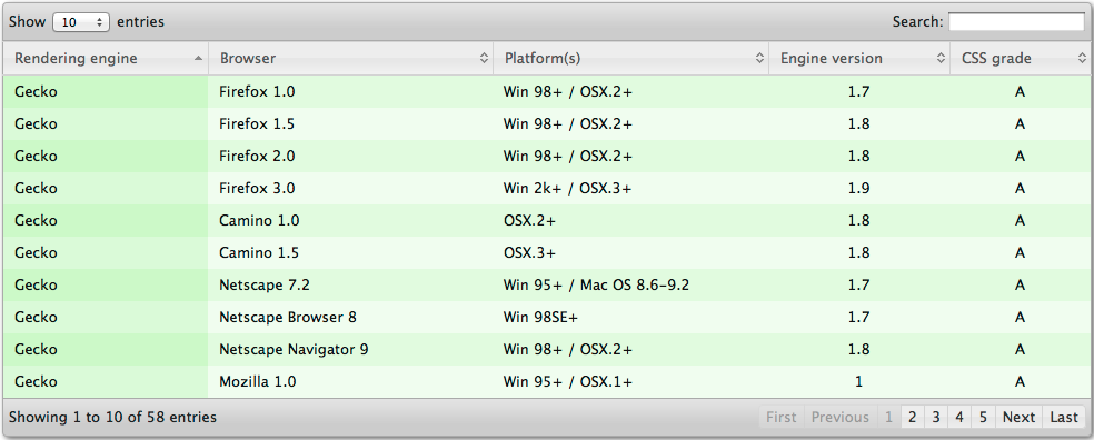 Datatables는 위의 그림과 같이 테이블을 동적인 테이블을 만들어주는 JQuery Javascript 라이브러리입니다. 다양하게 정렬할 수 있도록 테이블을 만들수 있으며, 따로 정보를 찾아주는 기능을 만들어주지 않아도 검색을 할 수 있는 기능을 제공하고, 정보를 편하게 볼 수 있도록 구성을 제공합니다. 그리고 DOM, Ajax, Server-Side Processing으로 쉽게 정보를 Datatables로 만들 수 있습니다.