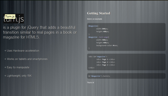 위의 Curtain.js가 세로형태의 전환 효과를 내는 것이었다면 가로형태의 전환 효과를 내야 하는 경우가 있습니다. 이러한 기능을 제공해주는 라이브러리가 바로 Turn.js입니다.