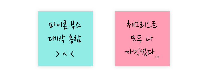 준비물로 포스트잇을 챙기셨죠? 각기 다른 색의 포스트잇은 여기서 씁니다. 한가지 색에는 “좋았던 점”을, 다른 색에는 “아쉬웠던 점”을 작성합니다. 한 포스트잇에는 한 가지 사건만 기록해야 합니다.