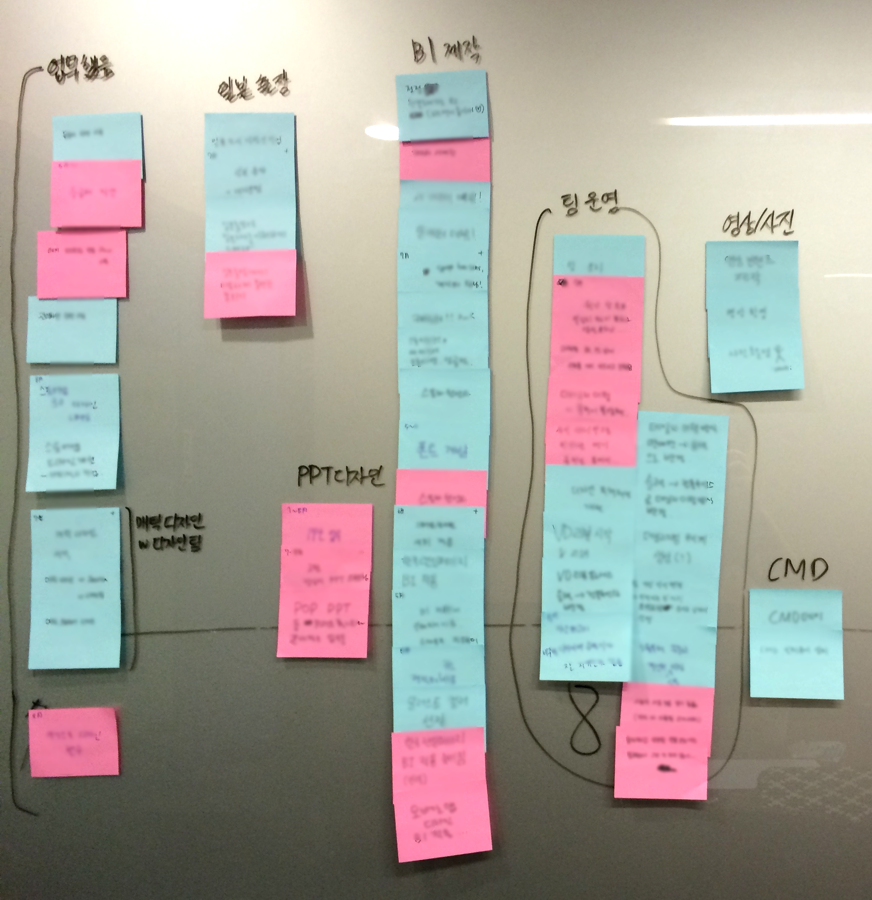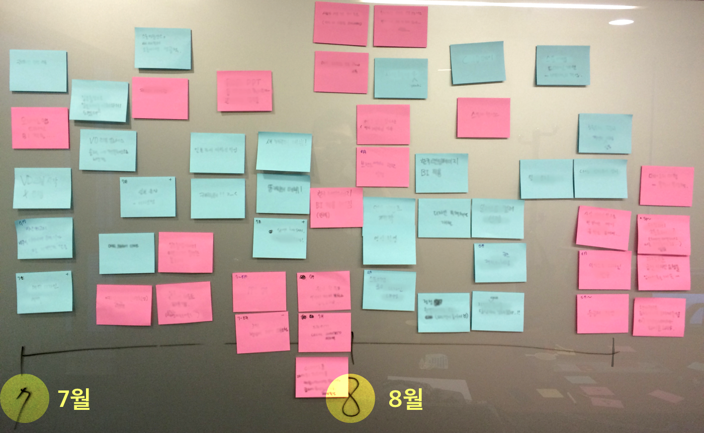 작성한 포스트잇은 화이트보드에 시간순으로 붙입니다. 그리고 누가 어떤 포스트잇을 붙였는지, 왜 이런 포스트잇을 썼는지 감상에 대해서 돌아가면서 이야기합니다.