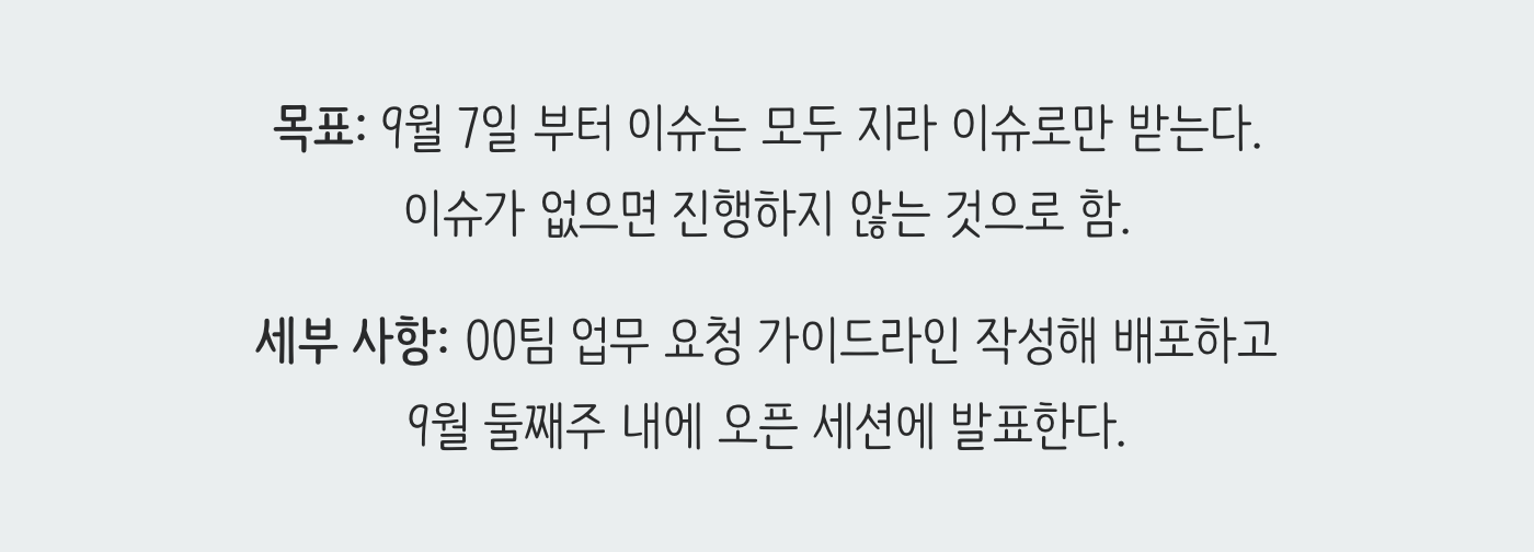 목표를 설정했다면 가능하면 이슈트래커에 이슈를 만들거나 사내 위키에 기록합니다. 회고 결과에 대해서 팀원이 아닌 다른 분들에게도 전체 회의 때 공유하면 더 좋겠죠?