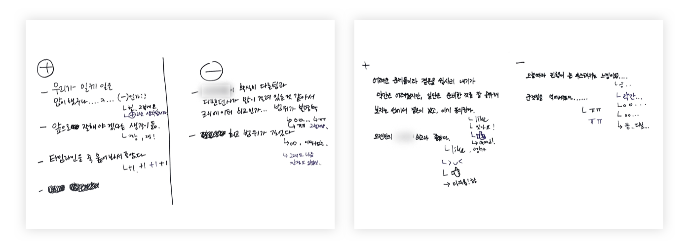 스티커가 많이 붙은 포스트잇 위주로 더 이야기해 봅니다. 이때는 액션플랜을 도출하기보다는 개인의 감상에 대해서 더 깊이 이야기를 나누고 서로 어떻게 생각하는지 깊이 들여다볼 수 있는 시간으로 가지는 것이 좋습니다.