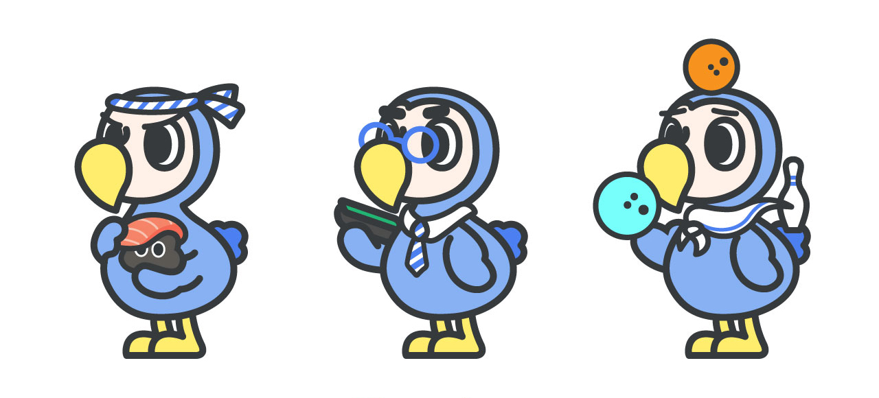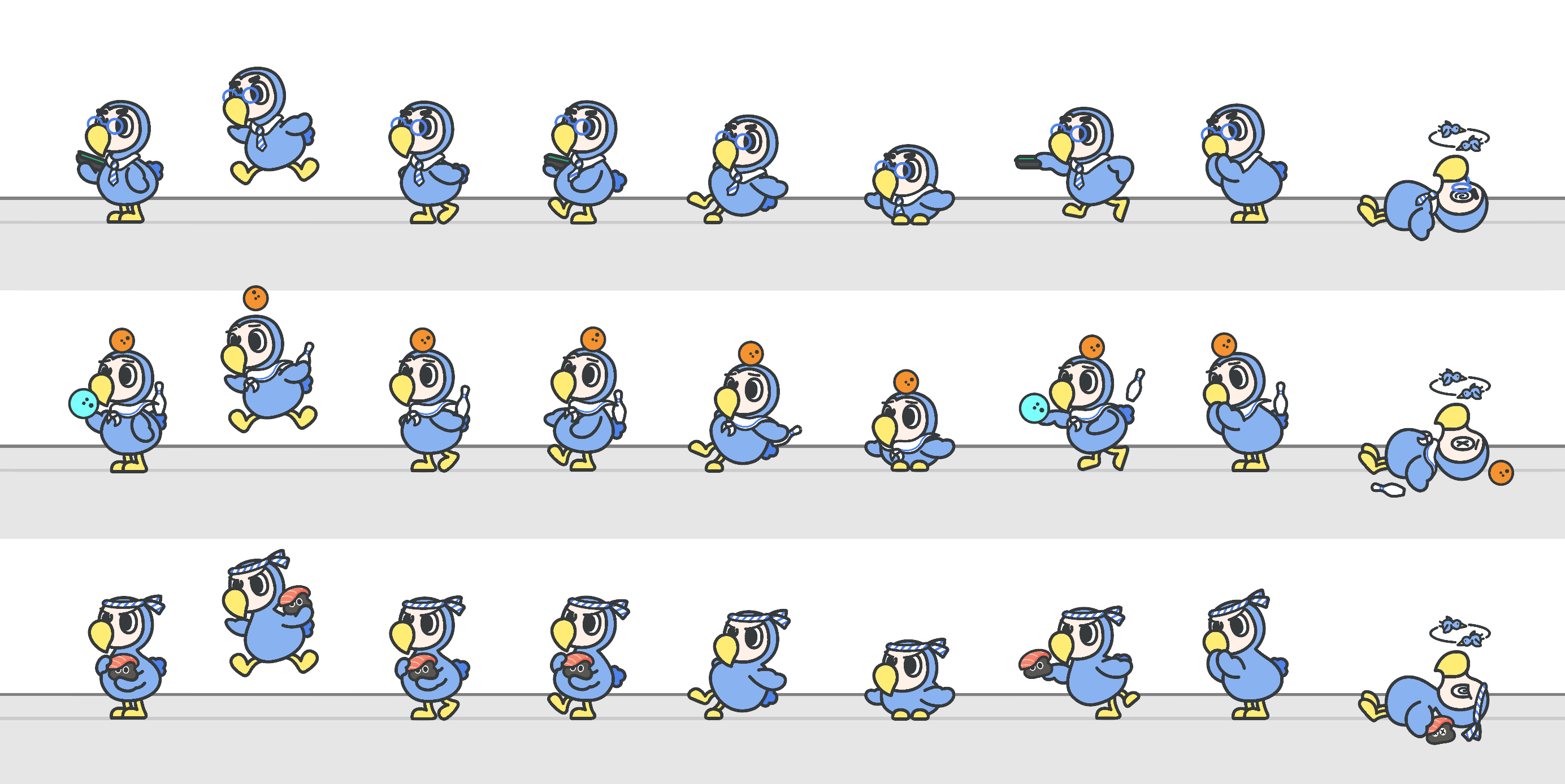 짧은 시간 내 게임을 완성하기 위해서 그래픽 리소스 제작 비용을 줄여야 했습니다. (인력 서포트도 있었습니다3) 기존에 잘 정리되어 있는 디자인 리소스들은 이런 상황에서 특히나 빛을 발합니다. 파이터는 포포(도도새 캐릭터)로 한정하고 동작 디자인은 거의 통일하기로 했습니다. 또한, 게임 특성을 고려해 기존에 디자인되어 있던 반측면 조형만을 활용했습니다.