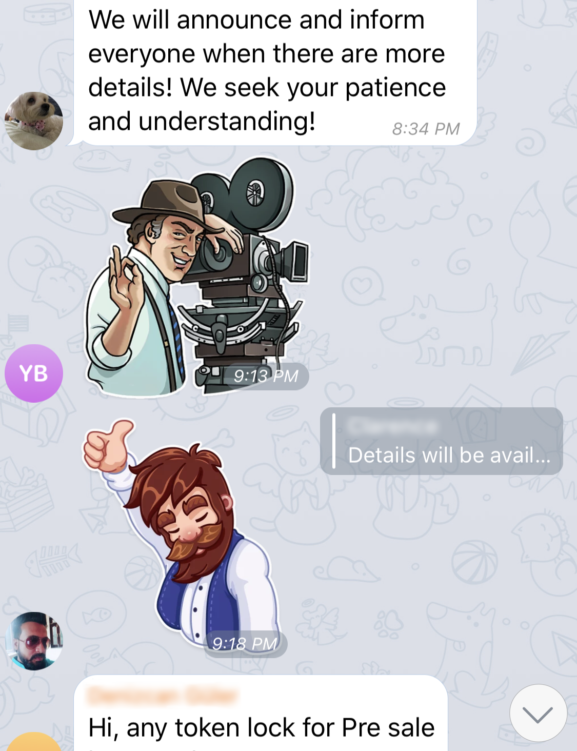 이런 특징을 가진 프로젝트다 보니 커뮤니티 사람들과 프로젝트 관계자 간 소통의 중요성은 긴말할 필요가 없었습니다. 계속 텔레그램 커뮤니티를 관찰하게 되었는데, 언어별 채널 관리자도 여러 명이며 수시로 쏟아지는 문의에 대해서 상시 즉각 응대하며 분주해 보였습니다. 직접 코인 구매에 참여하는 이벤트다 보니 민감한 이야기가 오갈 수도 상황이 있었는데, 그때마다 텔레그램 스티커의 역할이 눈에 띄었습니다. 문의 응대를 하고나서 만족한 사용자와 응대를 마친 관리자가 서로 엄지척 스티커을 보내거나 인사를 나누기도 하고, 다소 마음이 급한 사용자가 나타나면 차분하라는 스티커를 사용해 분위기를 한결 부드럽게 하기도 했습니다. 분명히 스티커는 커뮤니티 분위기에 일조하고 있었습니다.