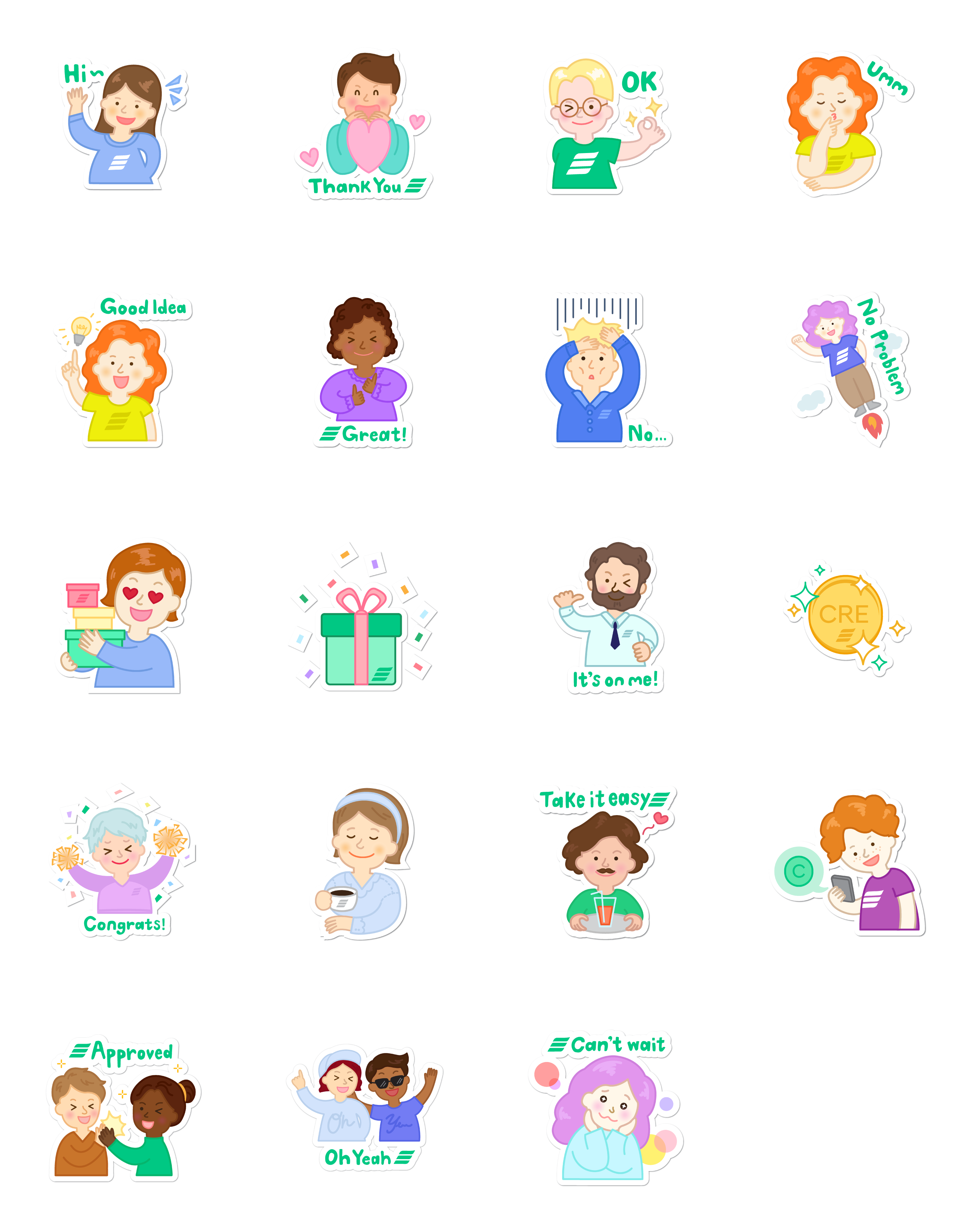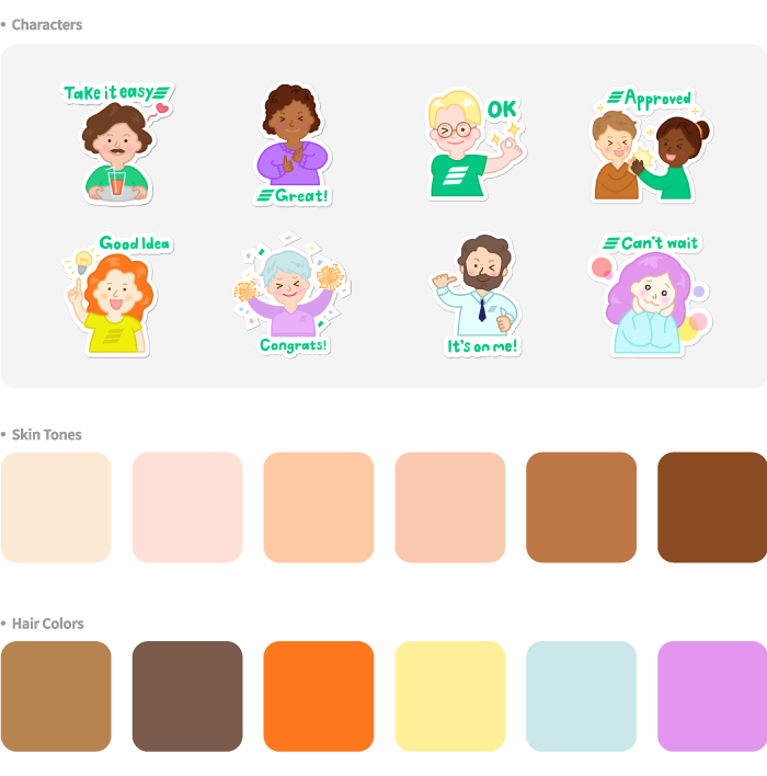 그렇기 때문에 외향적인 부분에서 다양한 성별, 인종, 나이가 등장하는 스티커 디자인을 의도했습니다. 특정한 한 두 캐릭터가 등장하지 않고 실제 세계에서 어디에서나 친근하게 볼 수 있을 것 같은 이웃 같은 캐릭터들.