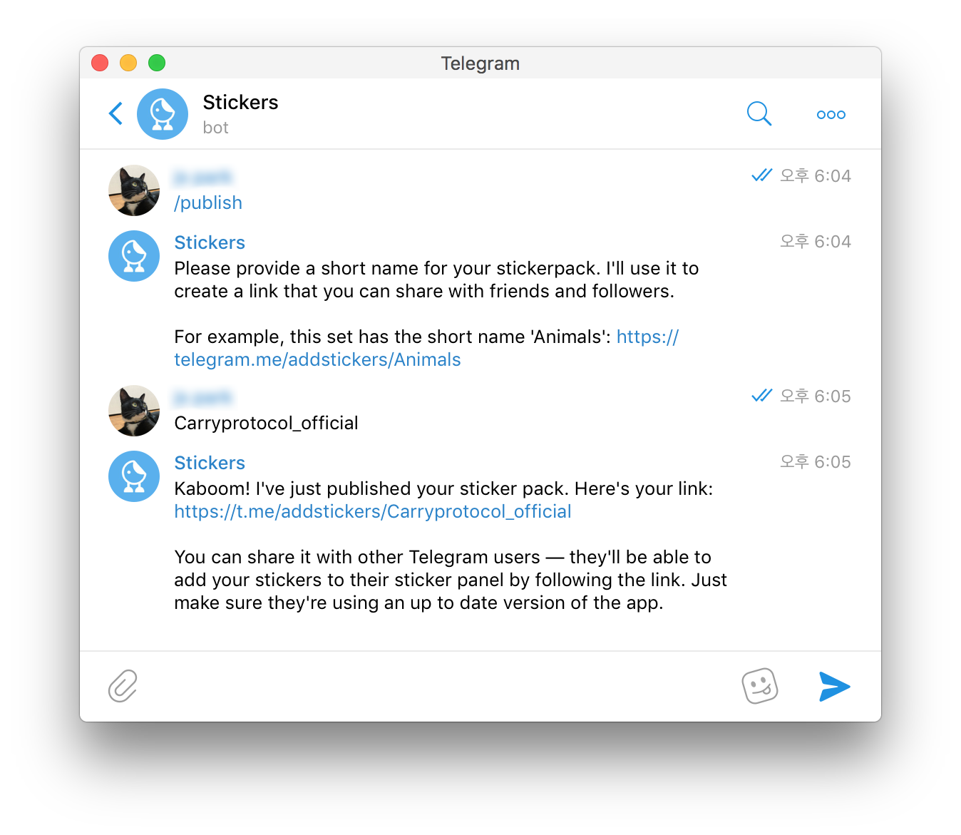 텔레그램에서는 스티커봇이 예시와 포맷을 자세히 알려주며, 절차도 스티커봇과 대화로 쉽게 스티커 팩을 등록할 수 있었습니다.