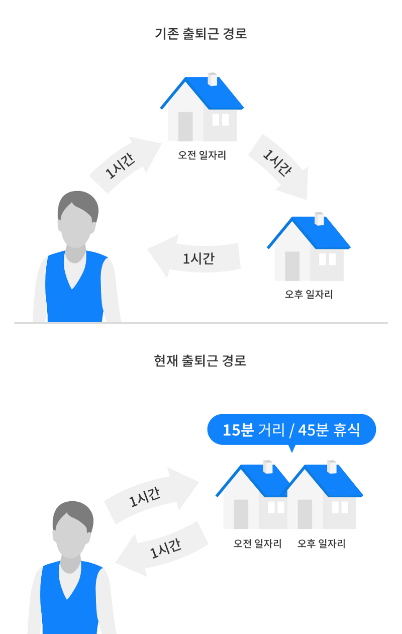 클리너님은 보통 오전 일을 위해 집에서 1시간 정도 이동하고, 거기서 오후 일을 위해 또 1시간 정도 이동합니다. 그리고 집으로 돌아가 하루를 마무리하죠.