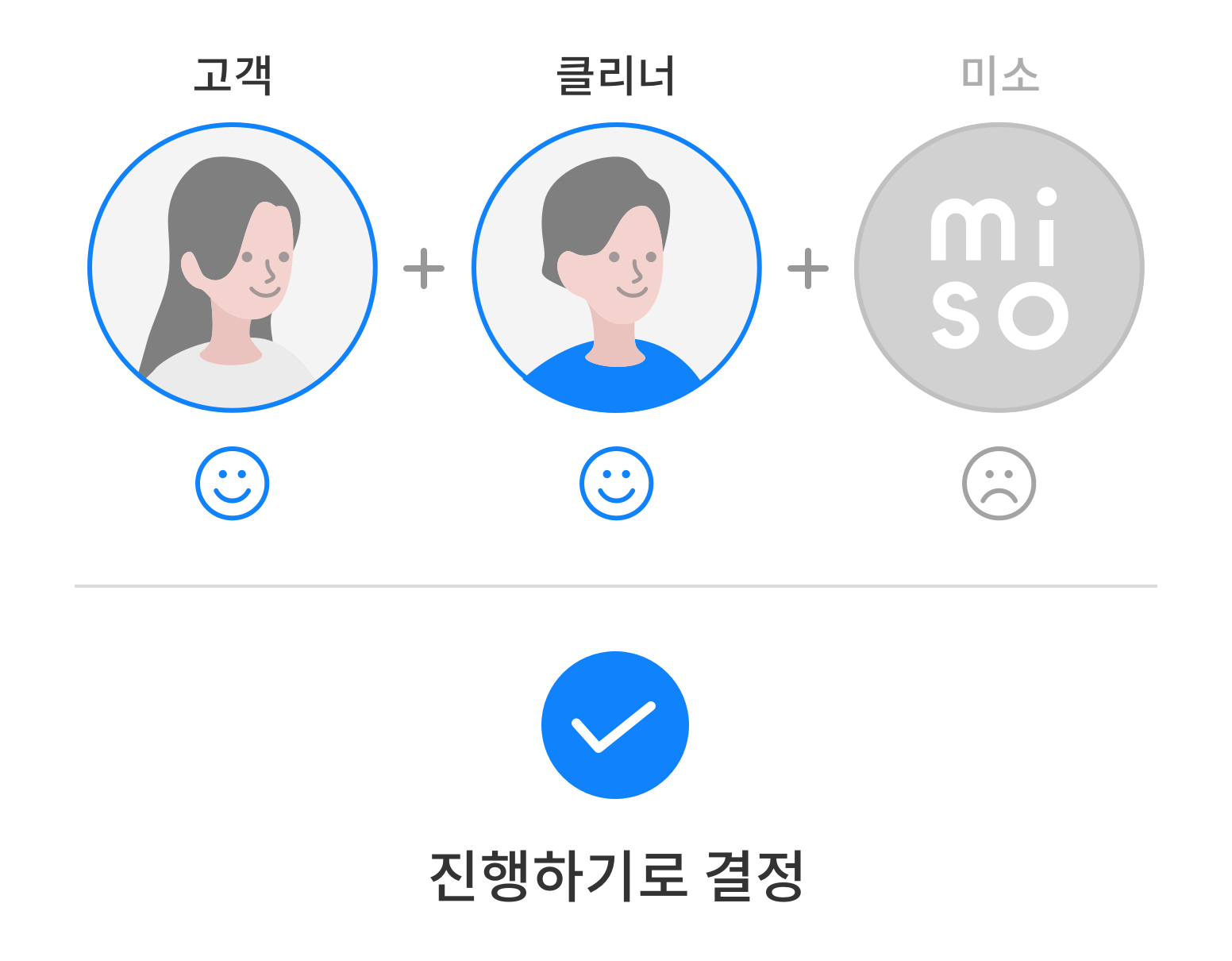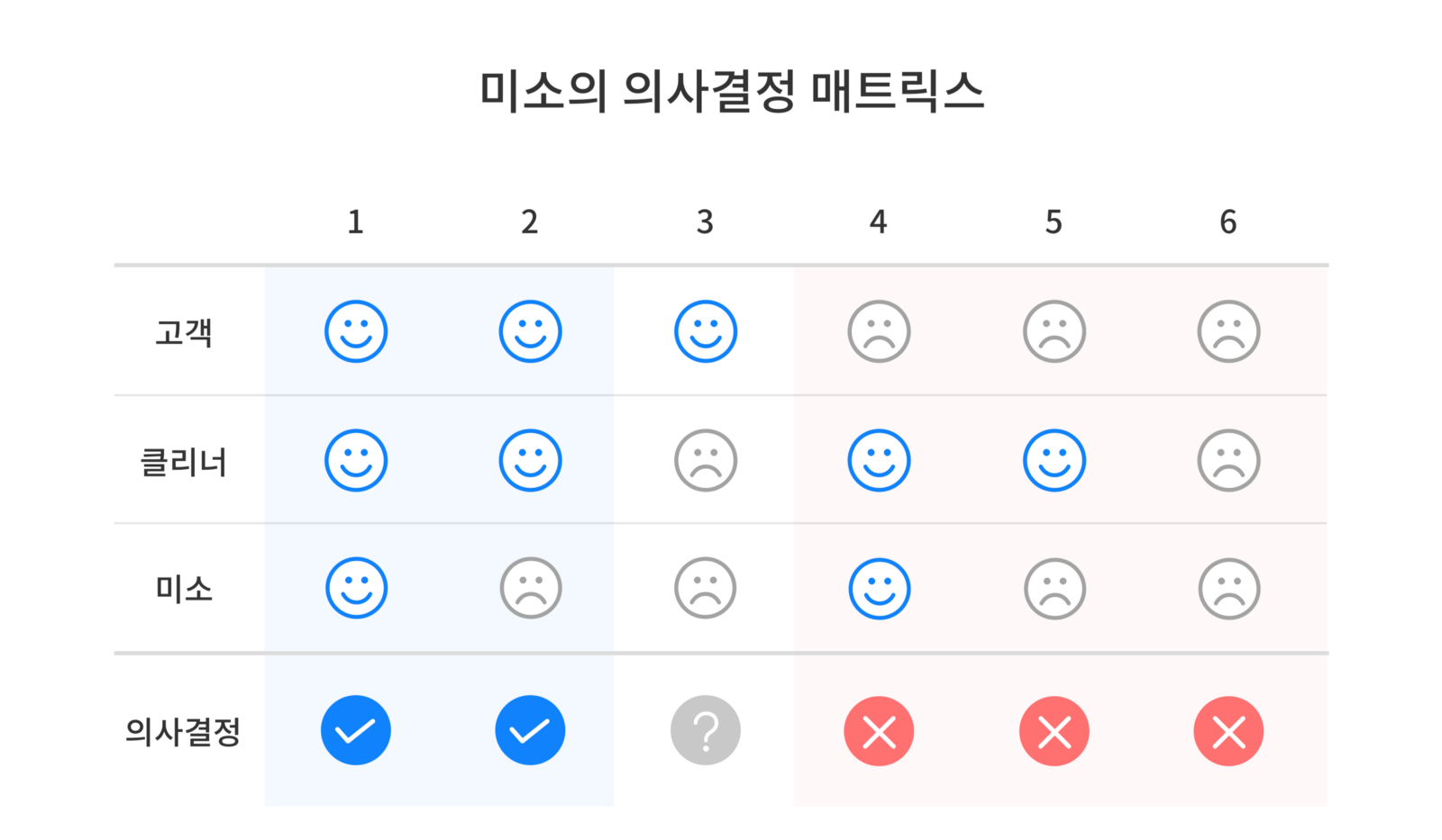 미소가 희생한다면 고객과 클리너에게 혜택을 줄 수 있으면, 미소는 해당 사안의 진행을 결정합니다. 당장 실행하기 쉽지 않지만, 고객과 클리너에게 혜택을 줄 수 있다면 장기적으로 미소도 혜택을 받을 수 있기 때문이죠.