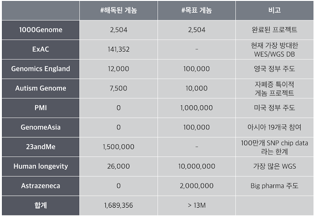 * 일본의 1,070명 게놈 프로젝트(http://www.nature.com/articles/ncomms9018 ), 한국의 1,100 게놈 프로젝트, 최근 핀란드 게놈 프로젝트 등 소개된 내용 이외 대규모 게놈 해독 프로젝트들이 다수 존재하나, 필자의 게으름으로 요 정도 선에서 정리 했습니다.
