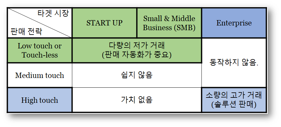 우선 Startup을 대상으로 하는 판매 전략은 Low touch 또는 touch-less 전략을 사용해야 한다. 비대면 서비스가 가능해야만 하는 것이다. 수많은 스타트업을 대상으로 너무 많은 터치를 해서는 안된다. 고객이 웹 사이트에 들어와서 고객이 되기까지의 루트를 자연스럽게 설계하는 것이 주된 역할이라고 할 수 있다. 대표적인 시장은 인터넷과 전자상거래 분야이다.