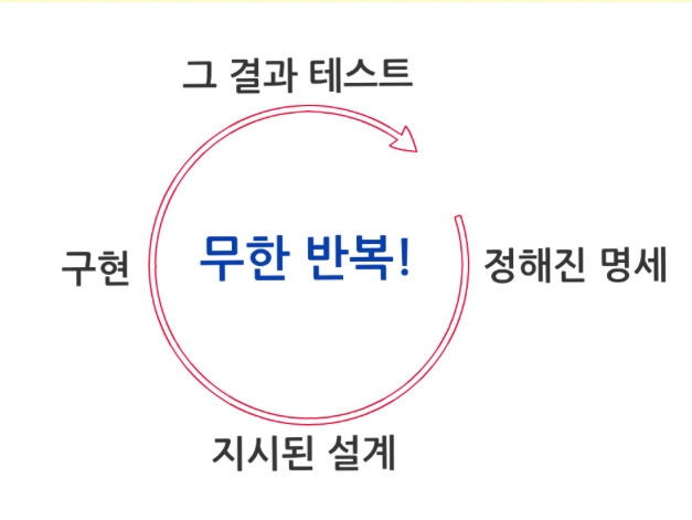 소프트웨어 개발과정을 도식화하면 위의 그림과 같다. ‘정해진 명세’에 따라서, ‘지시된 설계’를 만들고, ‘구현’하고 ‘테스트’를 하는 과정을 무한 반복하는 것이 소프트웨어 개발을 포장 없이 표현한 것이다. 실제, 소프트웨어 개발의 환경은 이렇게 ‘무의미한 작업’의 계속된 반복 인지도 모른다.