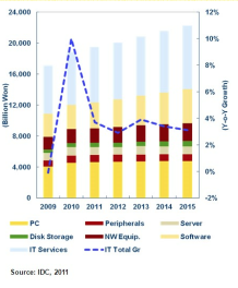 세상의 비즈니스 룰은 변하지 않고 하부의 구현 방법만 변하는 것이 실질적인 현실이라 하겠다. 냉정하게 국내의 일반적인 분류의 IT의 시장을 정의해본 자료를 찾아보자. 2012년 현재의 분류법에 의한 국내 IT 시장의 규모는 29조 5천억이라고 한다. 2011년보다 6% 정도 상승한 수치이다.
