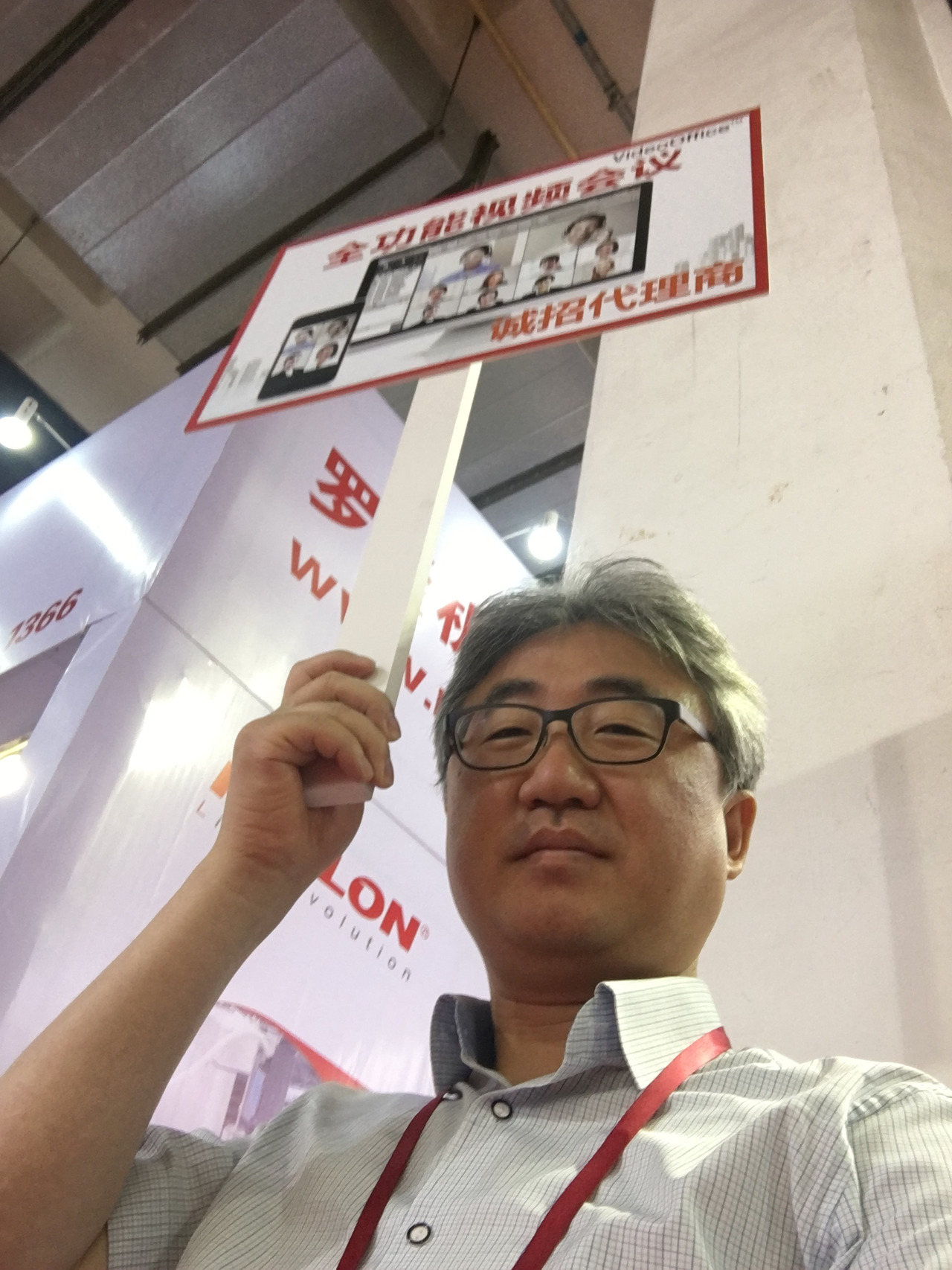 중국어에 능숙하지 못한 사진의 CEO와 해당 기업의 등기임원인 나는 중국어를 거의 못하는 관계로 둘이 나가서 전시회에서 찌라시를 돌렸다. 그리고, 나는 찌아시를 돌리는 친구인 CEO를 돕기 위해서 부스에서 좀 멀리 떨어진 장소까지 나와서 피켓을 들었다.