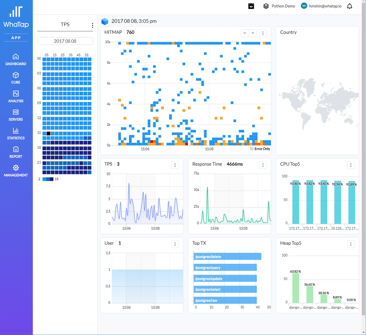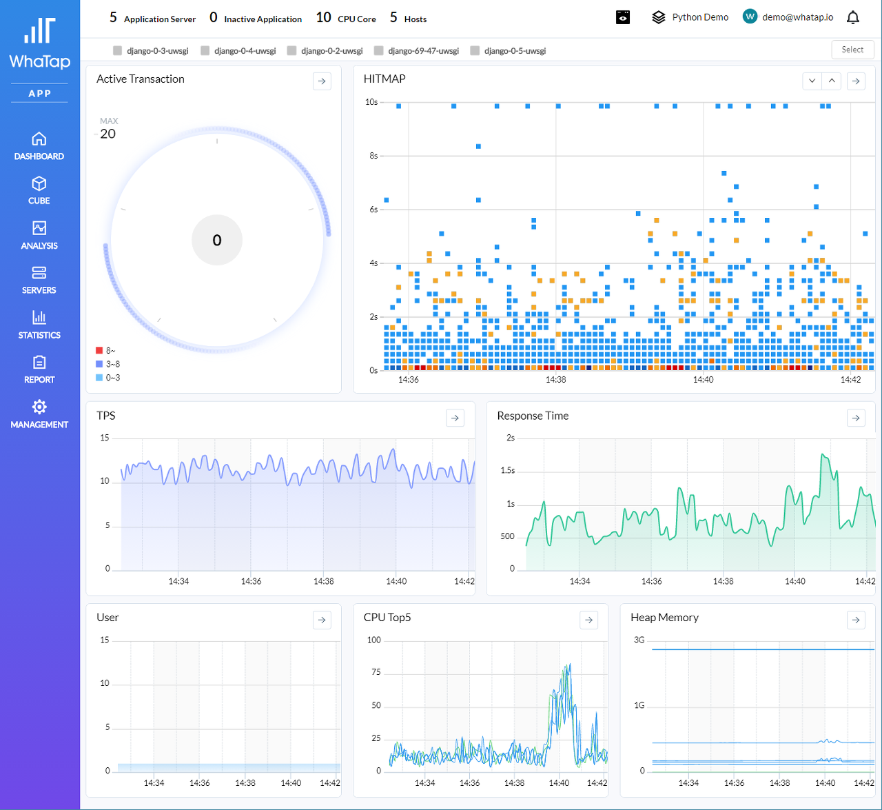 Python으로 백엔드 웹서비스를 개발하고 계시다면, WHATAP Python APM은 개발과 운용을 매우 풍요롭고 빠르게 해줍니다.