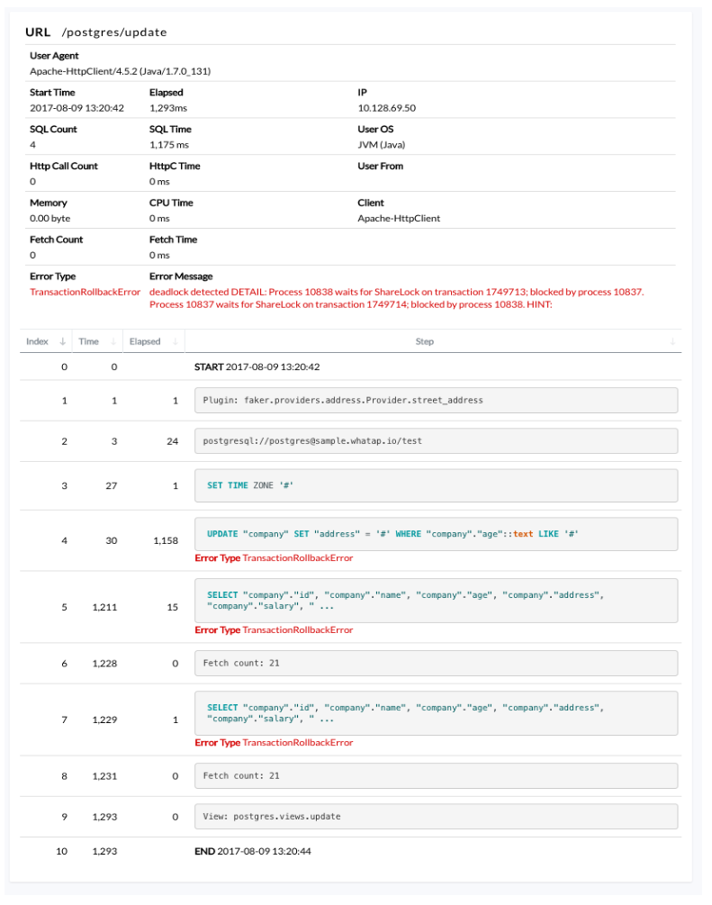 개발자는 단지 APM을 동작시켰을 뿐이지만, postgreSQL 데이터베이스에 연결하고 SQL문장을 주고받는 부분들을 하나의 시각화된 관점으로 나열해서 확인할 수 있습니다.