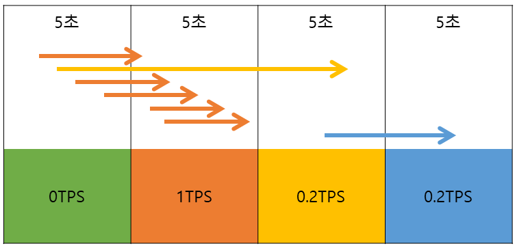 좀더 스토리를 만들어 보면 이렇게 이야기를 할 수 있습니다. 위 그림을 보면 동시 접속 사용자가 300명이 넘어가면 TPS는 더이상 올라가지 않으므로 서비스의 정체 시간은 증가하기 시작할 것입니다. 300명의 요청사항에 대한 TPS가 50이라면 해당 요청 사항을 다 처리하는데 6초가 걸린다고 생각할 수 있습니다. 이렇게 TPS와 동시접속자를 미리 선정해봄으로써 서비스의 성능을 상상해 볼 수 있습니다.