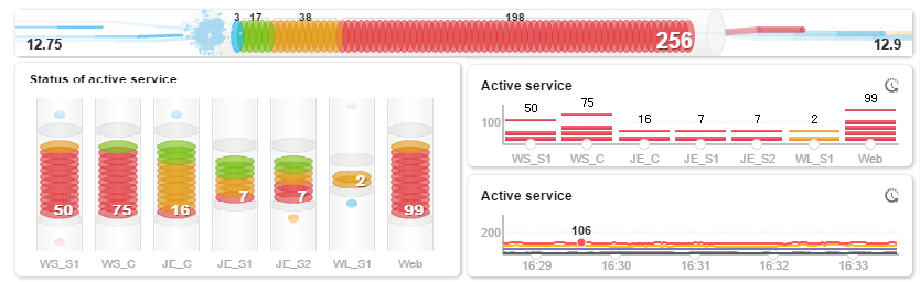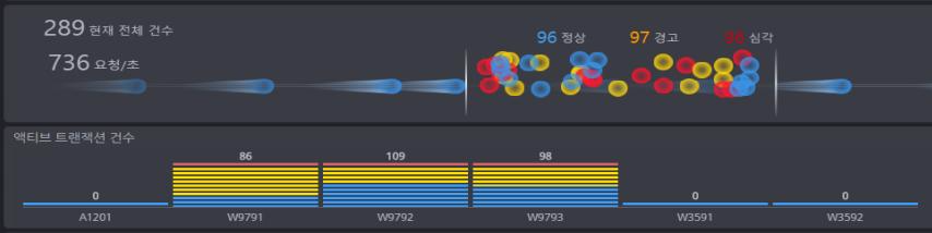 트랜잭션의 요청건수, 진행건수(Active Service), 완료건수가 상단에 나옵니다. 하단에는 다양한 방법으로 진행건수Active Service)를 보여주고 있습니다.