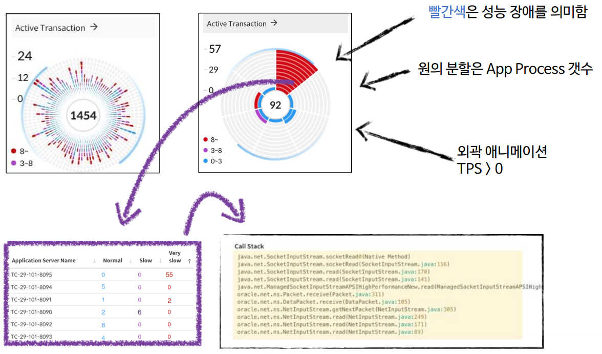 트랜잭션의 진행건수를 원형으로 보여주고 있습니다. 와탭의 서비스는 대용량 분석을 위해 기존의 이퀄라이즈를 원형으로 보여주는 특징을 가지고 있습니다. 액티브 트랜잭션은 서비스를 오픈하는 과정에서 큰 효과를 보입니다. 아직 서비스가 완벽하지 않은 상태에서 부하 테스트를 하게 되면 서비스에 락이 걸리면서 트랜잭션이 연속으로 홀딩되면서 서비스 전체가 다운되기도 하는데, 이렇게 되면 종료된 트랜잭션으로는 분석이 불가능하기 때문입니다.