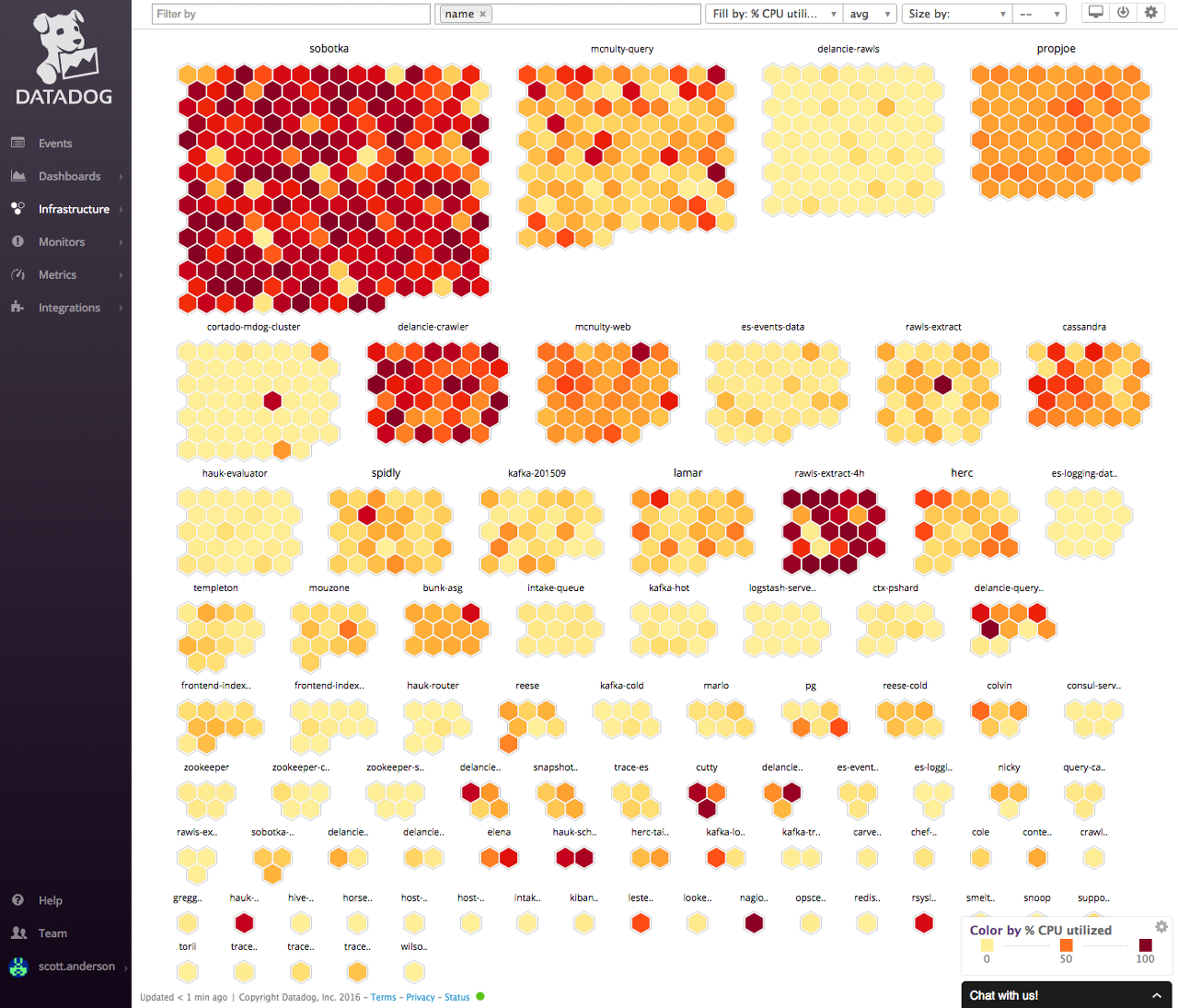 DataDog은 대규모 서버를 한눈에 볼수 있는 벌집 구조의 데시보드로 유명합니다. Application Performance Monitoring