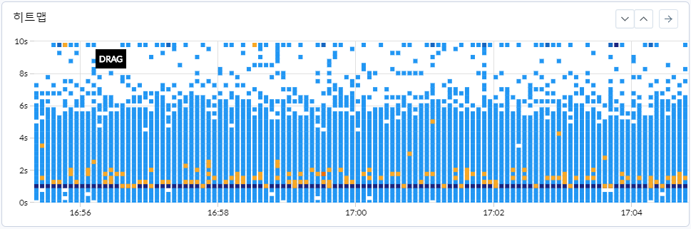 와탭의 응답시간 분포도Y 축: 트랜잭션 응답시간을 의미합니다. 10s는 트랜잭션이 시작에서 종료까지의 시간이 10초가 걸렸다는 것을 의미합니다.