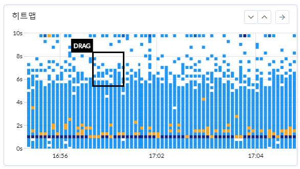 와탭의 응답시간 분포도는 트랜잭션의 응답시간을 시각화하는 것입니다. 웹 서비스의 트랜잭션을 시각화 할 뿐만 아니라 추적하고자 하는 영역을 드래그하여 트랜잭션의 진행상황을 추적하는 것도 가능합니다.