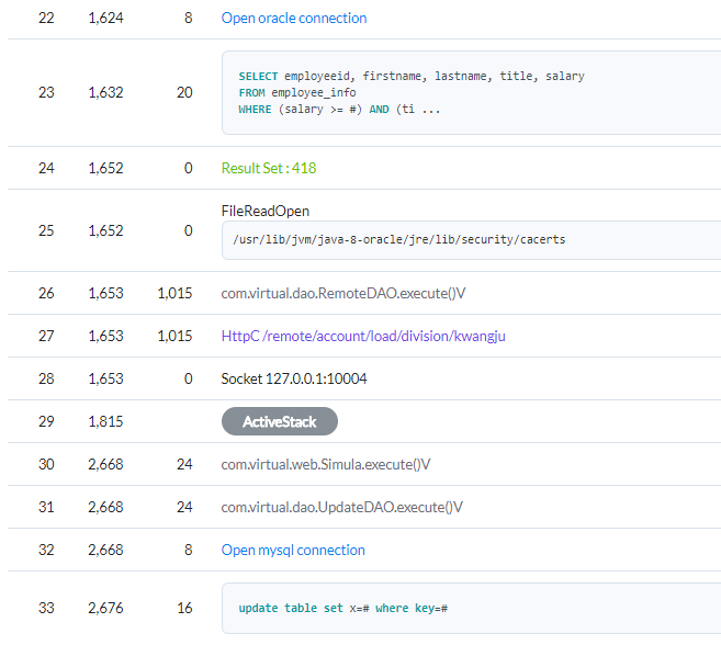 와탭의 애플리케이션 모니터링은 수집된 콜 스택 정보를 기반으로 아래와 같이 보여줍니다.