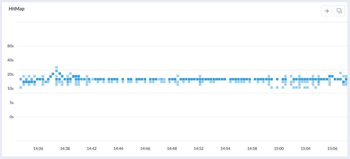 CPU 사용량은 변화량이 많은 지표입니다. 변화량을 비교하는 챠트로는 라인 차트가 가장 많이 쓰이지만 라인 차트는 개수가 많아지면 전체 상황이 보이지 않는 문제점을 가지고 있습니다. 또한 실시간으로 추가되거나 삭제되는 인프라가 생기는 클라우드 인프라 상황에서 라인챠트는 표현의 한계를 가지고 있기도 합니다. 이런 문제를 해결하기 위한 방법으로 아래와 같은 온도 차트를 사용할 수 있습니다. 온도 차트는 단위 영역에 밀도에 따라 색상으로 깊이를 표현하는 방식입니다. 최근 많은 양의 데이터를 표현하는 방식으로 많이 사용되고 있습니다.