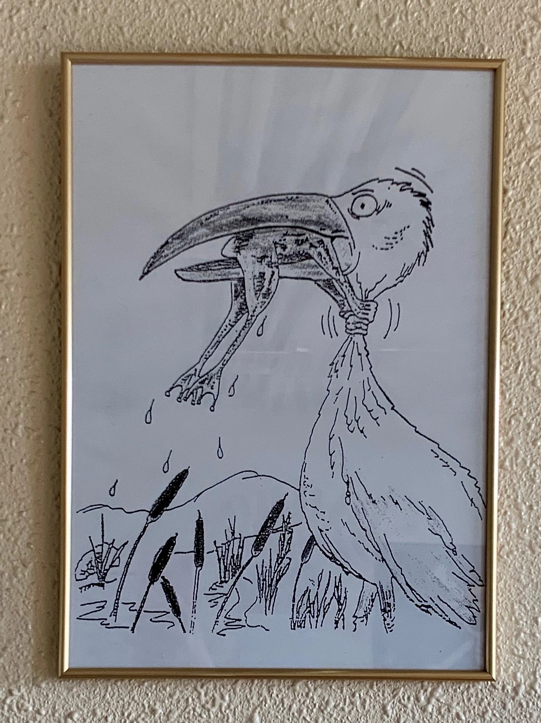 On the other side of the office, we have a rather funny-looking poster of a crane being choked by a frog about to get eaten. Although the frog is the prey, we get a sense that the crane is more vulnerable than the frog - it probably won’t let go of the crane’s neck until it’s released. Its tearful determination shines light on the values of perseverance and resilience, and certainly encompasses the positive energy at work.