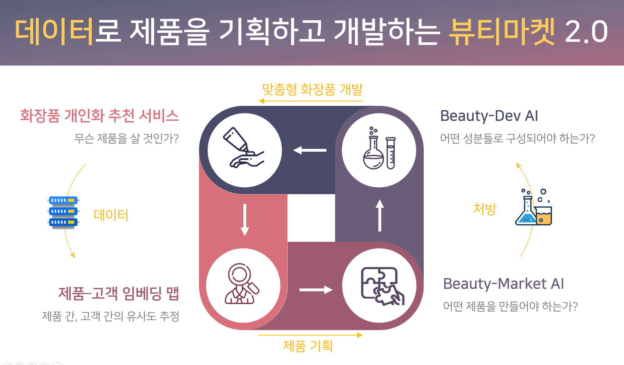 마지막으로 둘을 매칭하는 기술, 즉, 피부데이터와 화장품데이터를 어떻게 매칭을 해야 궁극적으로 피부를 개선시킬 수 있는지에 대한 기술을 개발 중에 있어요.