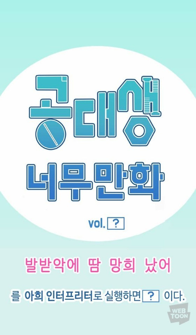 사진2. <공대생 너무만화> 15화, 1화, 6화, © 최삡뺩웹툰의 첫 컷에 각종 수학, 과학, 혹은 프로그래밍 관련 문제를 출제하기도 했는데 문제를 받아보는 독자들의 반응이 정말 재미있다. 열심히 문제를 풀기도 하지만 엉뚱한 반응이 나오기도 한다. 한번은 ‘<발받악에 땀 망희 났어>를 아희 프린터로 실행하면 ?이다’라는 문제를 냈다. 딱 보면 발바닥에 땀이 많이 났다는 한국어 문장을 외계어처럼 적은 것처럼 보이지 않나. 그렇지만 사실 ‘아희'라는 프로그래밍 언어로 된 코드다. ‘발받'이라는 코드가 숫자 3과 5를 뜻하고 ‘땀'은 곱셈, ‘망'은 출력이라는 뜻이다. 다시 말해 ‘3과 5를 곱셈하여 출력하시오'라는 코드다. 이 컷의 베스트 댓글은 ‘그냥 한글이라길래 왠지 모르게 순간 설렌 문과입니다'더라. 이외에도 기막히게 재밌는 댓글들이 쏟아졌다. 나중엔 몇몇 아희 인터프리터의 개발자들이 테스트 케이스로 이 문제를 넣어주더라.