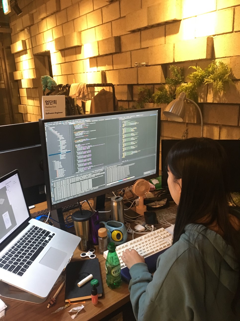 사진2. 파워 코딩 중인 단희 님Q. 최근 스켈터랩스가 여러 학교의 커리어페어에 다녀오면서 많이 들었던 질문 중 하나가 ‘인공지능을 전문적으로 공부하지 않았는데, 일을 할 수 있을까요?’였다. 혹시 이 질문에 대한 답변을 해줄 수 있을까.