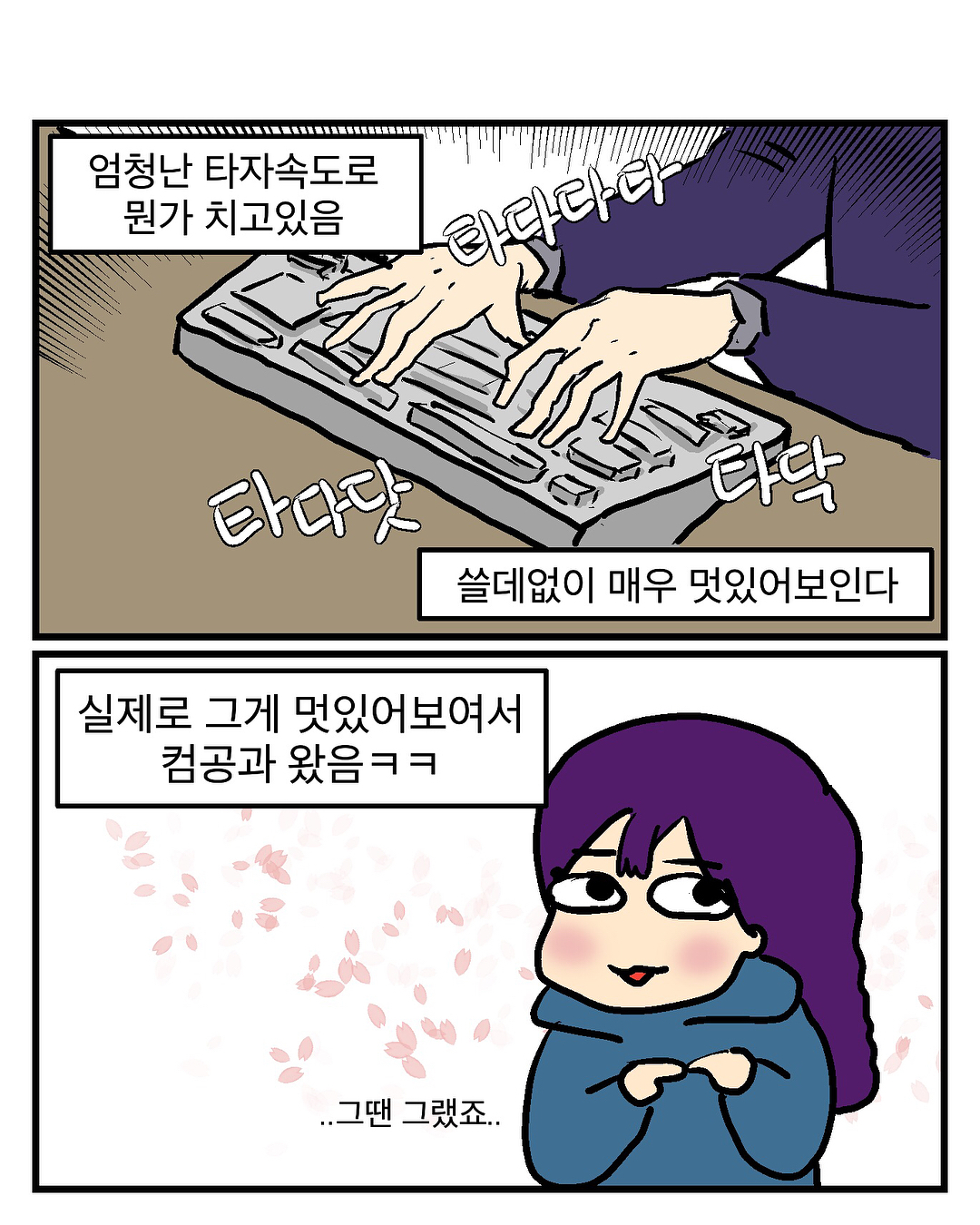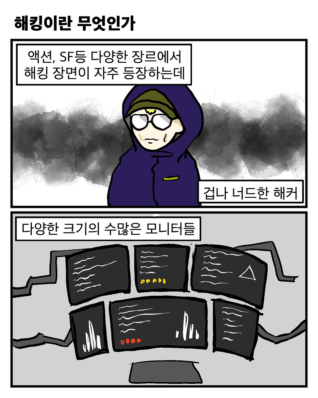 A. 이유는 생각보다 단순하다. 위에 웹툰에서도 그렸듯이 영화를 보면 꼭 대형 모니터를 여러 개 띄워놓고 멋지게 주인공을 돕는 해커들이 등장하지 않나. 게임을 많이 하게 되면서 자연스럽게 컴퓨터에 친숙해지기도 했고, 영화를 보면서 ‘나도 컴퓨터 관련 전공을 택하면 저렇게 멋있는 사람이 될 수 있지 않을까’라고 생각했던 것 같다. 다만 어떤 분야의 개발자가 될 것인가에 대한 고민은 많았다. 영화처럼 정보보안 쪽도 잠깐 발을 담갔지만 지금 당장 할 수 있는 분야는 아니라는 생각을 했고, 그 다음은 게임 개발자에 관심을 가졌다. 그런데 당장 게임 회사에 들어간다고 해도 꼭 내가 만들고 싶은 게임만 만들 수는 없다는 것을 알게 되서 보류했다. 나는 일단 스토리가 탄탄하고 재미있는 게임을 정말 사랑한다. 예를 들어 <화이트데이>라는 공포 게임을 정말 재밌게 플레이했었는데, 공포 요소도 한국 정서에 맞게 잘 구현되었으면서 미연시(미소녀 연애 시뮬레이션) 요소도 가미되어 신선한 느낌을 주었었다. 제일 중요한 스토리도 배경 시나리오부터 인게임 진행까지 반전에 반전을 거듭하며 게임이 끝나고도 생각해볼 여지가 많았다. 이런 게임을 만들고 싶지만 우선 희망 사항으로 남겨둔 상태이다. 그러다 우연히 입사한 스켈터랩스에서 훌륭한 선배 개발자들을 보며 ‘개발' 자체의 즐거움을 느꼈고 당장은 어떤 특정 분야에 국한하지 않고 순수한 개발 능력을 향상시키기 위해 노력하고 있다. 스켈터랩스에서 중요하게 다루는 인공지능은 특히 기술적으로 미래의 변화를 주도하고 있기에, 여러 방면에서 매우 배울 점도 많고 발전할 수 있는 것 같다.