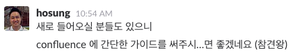 - 신입사원들이 들어오면 참고할만한 문서가 없어 한 페이지짜리 신입사원 안내서를 위키에 만들어 두었다. 그 후부터는 신입사원이 들어오면 그 문서에 적혀 있지는 않지만 새롭게 알게 된 것들을 문서에 업데이트해달라고 매번 부탁한다.
