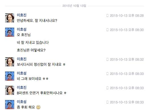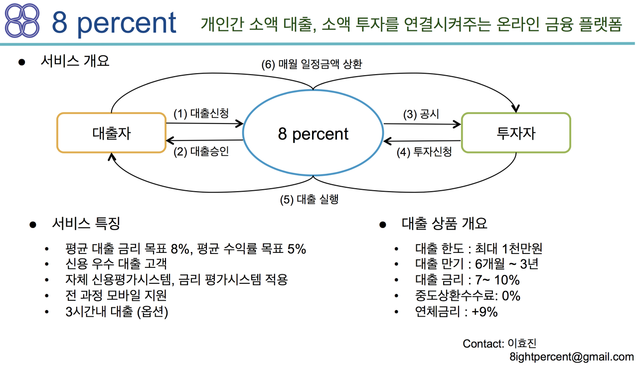 시간은 다시 흘러 2015년 10월이 되었다. 그동안 8퍼센트는 지속적인 성장을 했고 회사를 둘러싼 시장의 분위기는 모난 돌에서 시장을 열어가는 주목받는 스타트업이 되어 있었다. 나는 왠지 놓쳐버린 기회가 생각이 나서 한동안 페이스북 "8퍼센트 그룹"의 글을 막아두기도 했었다. 그리고 그동안 다니던 회사를 나와 새로운 일을 준비하고 있었다. 이때 다시 이효진 대표의 페북 메시지를 받았다.