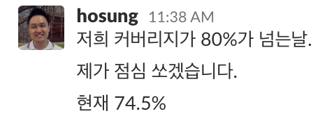 사실 80%가 특별한 의미가 있는 숫자는 아니야. 그냥 100줄의 코드에서 80줄의 코드가 테스트가 되고 있다는 것이지. 그래도 우리가 2년 동안 테스트를 중요하게 생각하고, 열심히 노력해 온 결과라고 생각하면 좀 뿌듯해.