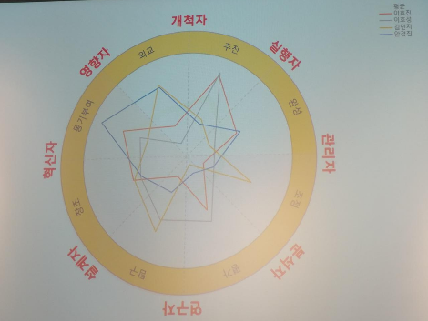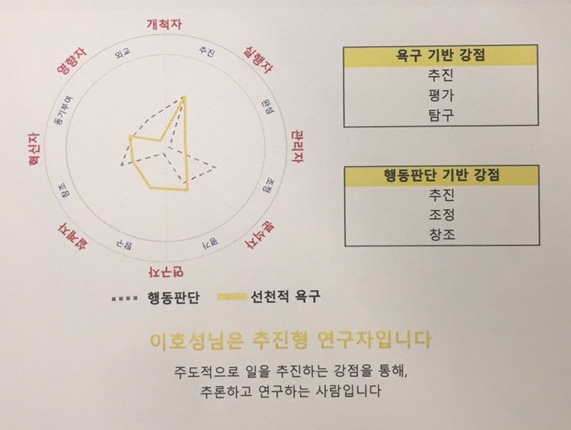 분석 결과를 보면 나는 사람과 사람을 이어주는 일과 일을 완성하고 관리하는 일에는 별 재능이 없다. 하지만 현재 나의 상황은 이런 일들이 많이 요구된다. 그리고 연구 영역에서의 기대가 줄어든 상황이다. 행동판단(점선)과 선천적 욕구(노란색)의 차이가 이런 것을 보여준다고 하니 재미가 있다.