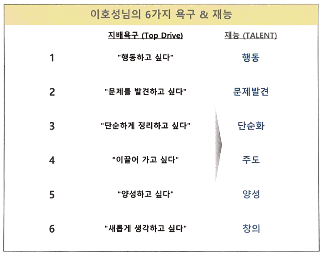 사람들은 욕구를 가지고 있다. 그 욕구는 곧 "내가 하고 싶은 그리고 남들보다 더 쉽게 할 수 있는" 재능의 기저가 된다. 나의 가장 큰 욕구 6개와 그로부터 발현되는 나의 재능은 다음과 같다.