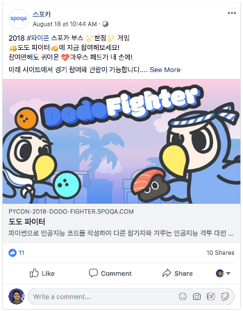 아이들과 오전에 놀아주고 집안일을 마치고 나서 지하철을 탔다. 파이콘에 가는 길이었다. 5년째 참석하다 보니 이제 모든 세션을 빡빡하게 들어야 한다는 부담이 없다. 그래서 늦었지만 여유로웠다. 가는 길에 습관적으로 본 페이스북 타임라인은 이미 파이콘 이야기로 가득했다. 인증과 세션 자료 그리고 개발자를 뽑고 싶어 하는 회사들의 홍보로. 피드에서 스포카에서 진행하는 도도 파이터 이벤트를 보고 "이건 뭐야?" 싶어서 링크를 눌렀다.