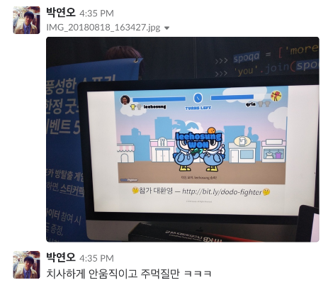 제출에 성공하고 기분 좋게 돌아다니면서 다른 부스도 구경하고 있는데 회사 슬랙으로 함께 파이콘에 참여하고 계신 동료 분이 메시지를 보내셨다.