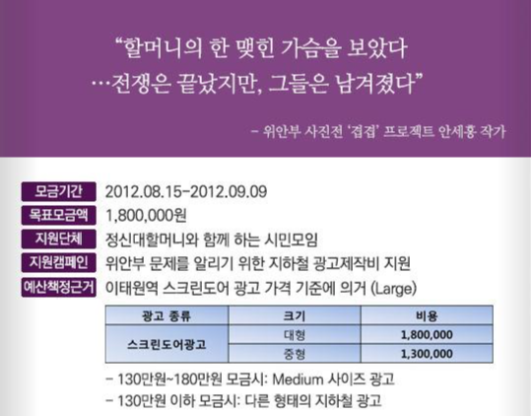 그런데 최근 위안부를 알리는 지하철 광고를 게재하기 위한 두 번째 움직임이 일어나고 있다. SNS와 온라인상의 결집력을 이용해 원하는 프로젝트에 자금을 동원하는 ‘소셜펀딩’에서다.