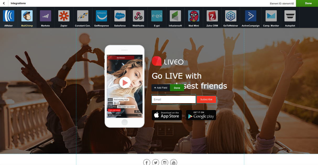 가장 마음에 들었던 부분은 외부 서비스와의 연계인데, 특히 이메일 주소를 받는 등의 추가기능이 필요한 경우 Integration 탭에서 정말 쉽게 넣을 수 있다. (라이비오의 경우 현재 이메일 주소를 받는 부분은 Mailchimp 라는 타 서비스와 연결되어있다.)